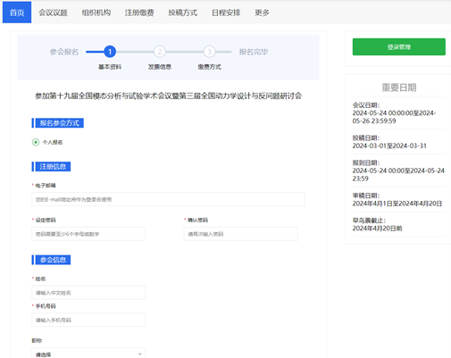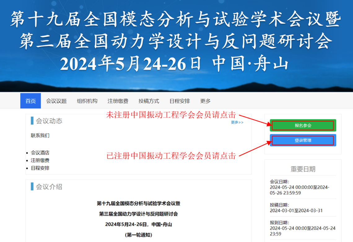 1. 如图1所示,已注册中国振动工程学会会员,可以直接点击“登陆管理”进行后续报名及缴费操作;未注册中国振动工程学会会员的,需要先点击“报名参会”并填写基本资料,如图2所示。