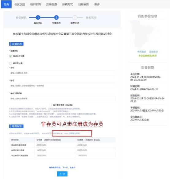 2. 未注册中国振动工程学会会员的在填写发票信息后,可选择点击“立即成为会员”注册成为中国振动工程学会会员,如图4所示,在校学生可免费注册成为中国振动工程学会学生会员,非学生注册成为中国振动工程学会会员需缴纳会费100元/年,成为会员后学会举办的所有会议均可享受会员优惠。